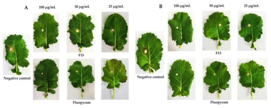 Regarding antifungal activity in vitro, compound F15 showed excellent fungicidal activity against S. sclerotiorum. As such, the curative and protective effects of this compound in vivo were evaluated, and the results are listed in Table 3. As shown in Table 3, compound F15 showed good curative effects at 100, 50, and 25 μg/mL, obtaining the values of 62.3%, 50.0%, and 27.7%, respectively, but these values were still lower than those that were obtained for fluopyram (100 (74.1%), 50 (71.4%), and 25 (65.0%) μg/mL). The protective effects of F15 at 100, 50, and 25 μg/mL were 71.0%, 66.0%, and 56.3%, respectively, which was close to fluopyram (100 (75.6%), 50 (69.3%), and 25 (66.8%) μg/mL). It is worth noting that the protective and curative effects of compound F15 showed concentration-dependent properties with these data, and F15 was demonstrated to be safe for cole leaves at high concentrations (Figure 4).