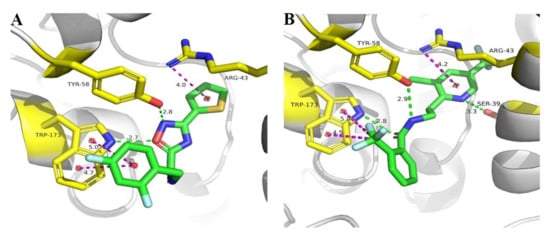 The results of the structure–activity relationship analysis showed that when the 3-position of 1,2,4-oxadiazole was substituted by an aromatic benzene ring with n = 2, the anti-B. cinerea and anti-S. sclerotiorum activities of the compounds with Py substituent in R’ were higher than other compounds with 3-Cl-5-CF3-2-Py, such as F1 > F2, F5 > F6, and F9 > F10. However, the activity was opposite when the 3-position of 1,2,4-oxadiazole was heterocyclic and when n = 2 (F14 > F13, F18 > F17, F22 > F21). Furthermore, the best activity was found for compounds with n = 1 and R′ = 2,4-di-F-C6H3 when the R group was the same, such as in compounds F3 > F1, F2, F4 or F15 > F13, F14, F16. In addition, the activity of the compounds with R = thienyl was better than the activity observed in the other groups where R′ = 2,4-di-F-C6H3, n = 1, for instance, F15 > F3 > F7 > F11 > F19 > F23. Furthermore, when R′ = 2-Py, n = 2, electron-donating group or electron-withdrawing group on phenyl both went against the inhibitory to S. sclerotiorum, as compounds F1 (R = C6H5) > F9 (R = 4-Cl-C6H4) > F5 (R = 4-CH3-C6H4). At the same time, when R′ = 2,4-di-F-C6H3, n = 1, the compound with phenyl in R has more antifungal activity against both B. cinerea and S. sclerotiorum. In addition, lipophicity affects antifungal activity, such as F3 (R = C6H5) > F7 (4-CH3-C6H4) > F11 (4-Cl-C6H4), with the CLogP value (according to Lipinski’s rule, CLogP < 5) are 3.8, 4.3, and 4.5, respectively. These results illustrated that a large steric hindrance of the R group was adverse to fungicidal activity. Meanwhile, when the R was the same, the compounds with R′ = 2,4-di-Cl-C6H3 and n = 0 showed the lowest activity, examples of which can be seen in compounds F15 > F14 > F13 > F16.