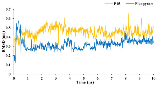 Plots of the RMSDs of SDH with compound F15 and fluopyram during the 10 ns simulation.