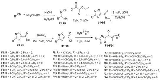The synthetic route of title compounds F1–F24 is shown in Scheme 1. First, the different substituted nitriles were reacted with hydroxylamine hydrochloride to obtain the amidoxime a []. Then, compound b was obtained from the reaction of intermediate a and ethyl oxalyl monochloride in acetonitrile, and then hydrolysis with LiOH in EtOH was enacted to obtain key intermediate c using methods according to previous methods in the literature [,]. Following this, intermediate c was reacted with oxalyl chloride to produce intermediate d [], which in turn was reacted with the primary amine to obtain compounds F1−F24.