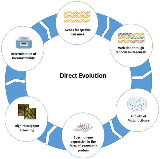 Darwinian evolution is a natural process by which the selection of a particular character is favored by natural selection through environmental selection pressure. Genetic diversity, mutation, recombination, and error in DNA replication are driving forces to adopt the environmental selection pressures. This leads to the development of specific traits through natural selection required for the survival of species in specific extreme conditions—in the hottest and coldest environments [26]. These traits are expressed in the form of proteins, enzymes, or other specific characters to mitigate harsh environmental conditions. Enzymes from such living organisms are isolated and then used at the industrial level for multiple purposes such as feed, food, medicine, etc. [27,28]. These selected traits are passed to successive generations. However, evolution is a time-consuming process. It takes much time (sometimes millions of years) to develop a specific trait for a particular environment. In recent decades, researchers have mimicked the natural evolution process at the lab bench, known as direct evolution, which is a method that was awarded the Nobel Prize in chemistry in 2018—it is a specific conceptual and methodological approach within enzyme engineering. The four steps (Figure 2) involved in in vitro evolution or direct evolution are: (1) creating diversity in enzymes through different mutagenesis methods such as random mutagenesis or site direct mutagenesis in the initial gene pool; (2) making libraries of mutant/variant types of enzymes through recombination; (3) separation of desired enzymes through applying evolutionary pressure, high throughput screening for variants with desired properties; (4) amplification of desired variants to repeat the further cycle of mutagenesis, library formation, screening, and finally amplification. This cycle is repeated multiple times until the enzymes gain desired characteristics [29]. In direct evolution, diversification and screening are repeated multiple times. Different techniques are employed to develop diversity in enzymes. Error-prone polymerase chain reaction (epPCR) is one of the most efficient strategies to develop the desired traits/characteristics in enzymes. The direct evolution method gradually accumulates the particular advantageous mutation. Low error-rate mutagenesis, such as 1 to 2 amino acids changes in the protein by epPCR, can avoid the missing of beneficial mutations [29].