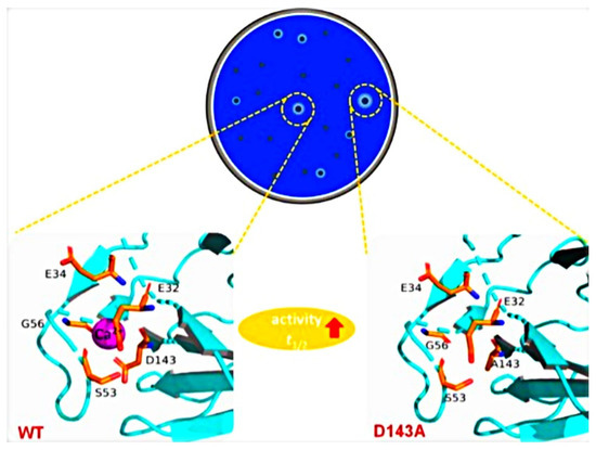 There are several currently available rational design strategies to improve enzyme thermal resistance; the most commonly used rationally designed technique is protein or enzyme engineering through disulfide bridges, surface charge optimization, hydrogen bond, proline factor, and salt bridge [52]. The disulfide bridge plays an important role in the structural stabilization of the enzyme with a reduction in unfolding entropy. Different molecular simulations can be employed to design thermostable enzymes based on disulfide bridges. In surface charge optimization, many charged amino acids are present at the enzyme surface; by balancing or optimizing charges through dynamic simulation, users can computationally design thermostable enzymes. The B-factors in the structure of proteins have a direct relation with diffusion, the higher the B-factors means higher diffusion and less stability. All these strategies can increase enzyme stability by increasing protein foldability, rigidity, and decreasing enzyme subunits’ free energy at the structural level. In many applications of rational design, increasing the number of hydrogen bonds and salt bridges increases the thermal stability of many enzymes for industrial and pharmaceutical applications. Proline is the most important factor for increasing the stability of enzymes [53]. The introduction of proline into the peptide chain’s loops increased the thermostability of many enzymes. To increase the thermal stability of endo-1,4-β-galactanase (TSGAL), a single proline substitution—K31P, T172P—is performed. Proline factors are also employed to increase the thermostability of green fluorescence protein (GFP) and collagen. The hydrophobic core is very important for increasing the foldability of enzymes to develop tolerability against physical factors. Researchers are introducing different types of computationally based strategies to develop a fully hydrophobic compact core of enzyme against high temperature [54,55]. Enzyme stability can be improved through the introduction of many mutations. However, during rational design, sometimes a single mutation can destabilize and disturb the enzyme protein folding as well as enzyme thermostability with a low boiling point. That is why a high amount of predictive precision is essential for the rational design of enzymes. Unfortunately, all existing approaches have a very high possibility of negative mutagenesis inside the enzyme coding gene. That is why enzyme stability can be maintained by adding predictive stabilized mutations inside the enzyme coding gene [56].