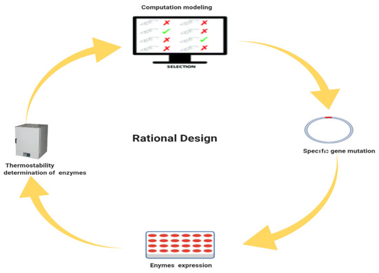 Rational design methodologies have been employed to design the cytosine deaminase enzyme against high temperatures. In this study, the free energy or energy function was used to evaluate cytosine deaminase enzyme efficiency to fix the target sequence in the amino acid chain. However, the adaptation of these sequences with low free energy was automatic. Based on this experiment, the author identified three beneficial mutations. After combining these mutations, they developed remarkable efficiency and thermostability of cytosine deaminase enzyme against high temperature [48]. Lipase is used in industries as a catalyst for the production of multiple commercial products. Industrial catalysis processes occur at high temperatures; rational design with computational modeling software such as the Rosetta approach is used to develop thermal resistance and stability in the lipase enzyme. This has increased the melting temperature up to 44 °F [49]. Cutinase is a key biocatalyst for polymer degradation. This enzyme is widely used in the cosmetics, food, and insecticide industries. The rational design with biological modeling software Rosetta was used to increase the thermostability of cutinase, increasing the thermostability 10 times higher than the wild type [50].