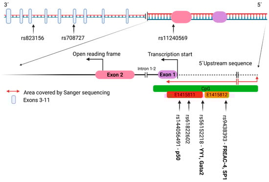 Gene organization of A1 including adjacent upstream 5′UTR. According to Ensembl Transcript: SLC41A1-201 ENST00000367137.4, this gene is located on chromosome 1 and consists of 11 exons. Exon 1 represents 5′UTR (untranslated region), and exon 2 contains a part of this 5′UTR. 3′UTR is included in exon 11. In our previous study, we studied three SNPs (single nucleotide variants), namely rs11240569, rs708727, and rs823156 in A1 []. In this work, we analyzed a sequence (1638 bp in length) located upstream of this gene. This sequence covers the 5′upstream sequence and, partially, exon 1. According to the UCSC genome browser [], the sequence is a regulatory region represented by CpG islands (green rectangle). A promoter-like signature (EH38E1415811) and a proximal enhancer-like signature (EH38E14112) (red and orange rectangle, respectively) have been described in this region. We have identified four SNPs (rs144056491, rs61822602, rs56152218, and rs9438393) in this sequence. At rs144056491, a search within the reference sequence and then in the sequence with the variant resulted in the identification of a binding site for transcription factor p50. At rs9438393, the search resulted in the identification of a binding site for transcription factor FREAC-4 (the A allele). However, no binding site was detected in the variant sequence (G allele). At the same SNP, the G allele allows the binding of SP1. At rs56152218, the dominant T allele enables the binding of Gata2, and the minor allele that of YY1.