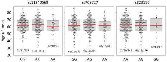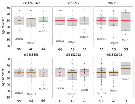 Correlation between the particular genotypes at each tested A1 SNP with age of onset of PD in cohort of 508 PD patients. Red line indicates median. Numbers below each plot indicate mean/SD/N.