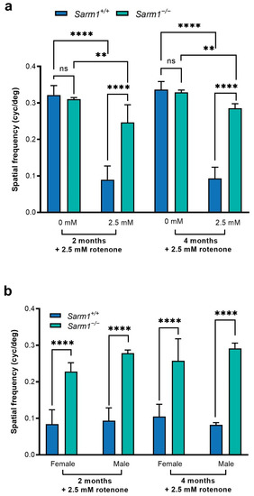 Given the inhibition of complex I and oxidative stress resulting from rotenone insult [43,44,45,46,47,48,49], it is not surprising that we observed significant RGC death in rotenone-insulted wild type and Sarm1−/− retinas. Rotenone insult resulted in a non-significant decrease in cell number in the inner and outer nuclear layers (Figure S1). While RGC death occurred in both genotypes (Figure 3b), we observed higher numbers of RGC cell bodies in Sarm1−/− retinas following insult than in controls, indicating protection by SARM1 ablation against progressive degeneration of RGCs. It is perhaps notable that protection of RGC function despite RGC loss has been reported previously [58]. Optic neuropathies tend to be characterised by injury to the axons of RGCs, which subsequently start to degenerate, resulting in a loss of connectivity between the retina and brain, with ensuing somal degeneration [7,13]. While most optic neuropathies cannot be reversed [7], some benefit may be obtained from intervention delaying damage to the optic nerve from progressing to the cell body [59]. Critically, we have shown significant protection of axonal density in the optic nerve of Sarm1−/− mice receiving rotenone (Figure 4c,f). Moreover, we have demonstrated in vivo significant rescue of functional connectivity between the retina and the brain in Sarm1−/− mice treated intravitreally with a rotenone insult, as demonstrated through preservation of spatial vision in both sexes over time compared to controls (Figure 1) and maintenance of PhNR (Figure 2).