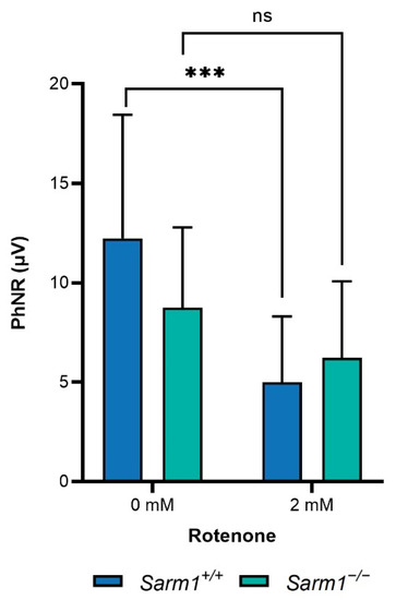 Analysis of PhNR. Rotenone was delivered via intravitreal injection. PhNRs were measured six weeks post-injection. Bar charts represent the mean PhNR. Error bars represent SD, *** p < 0.001, ns = non-significant. Reduction in PhNR following rotenone treatment was significantly greater in wild type Sarm1+/+ mice (12.23 ± 6.22 μV vs. 5.01 ± 3.3 μV; p < 0.001) than Sarm1−/− mice, where the reduction was not significant (8.75 ± 4.04 μV vs. 6.23 ± 3.85 μV).