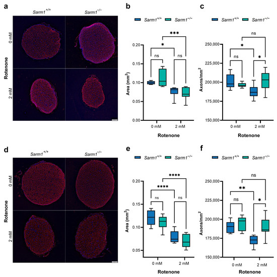 Given the role of SARM1 in axon degeneration, optic nerves were analysed to assess whether ablation of SARM1 protects against degeneration of RGC axons. Two months after rotenone administration, optic nerves were cryosectioned and stained for Neurofilament 200 (NF200). Sections from the proximal and distal optic nerve, defined as the portion of the nerve close to the eye and brain respectively, were analysed separately. Quantification was performed on 3–5 sections per sample, with n = 6–10 optic nerves per group. Both proximal (Figure 4b) and distal (Figure 4e) optic nerve thickness was reduced in both genotypes following rotenone treatment (Proximal: Sarm1+/+ 0.10 ± 0.004 mm2 vs. 0.08 ± 0.02 mm2, p < 0.05, Sarm1−/− 0.11 ± 0.02 mm2 vs. 0.07 ± 0.02 mm2, p < 0.001; Distal: Sarm1+/+ 0.12 ± 0.02 mm2 vs. 0.08 ± 0.01 mm2, p < 0.0001, Sarm1−/− 0.11 ± 0.02 mm2 vs. 0.07 ± 0.01 mm2, p < 0.0001). However, Sarm1−/− optic nerves receiving rotenone had increased axonal density relative to wild types (Proximal optic nerve: 201,631 ± 12,619 axons/mm2 vs. 187,926 ± 7851 axons/mm2, p < 0.05; Distal optic nerve: 188,764 ± 13,580 axons/mm2 vs. 172,002 ± 7086 axons/mm2, p < 0.05). Indeed, density of axons in proximal (Figure 4c) and distal (Figure 4f) rotenone-treated Sarm1−/− optic nerves was similar to that of nerves that had not received a rotenone insult (Proximal: rotenone-insulted Sarm1−/− 201,631 ± 126,219 axons/mm2 vs. uninjected Sarm1−/− 196,265 ± 3030 axons/mm2, uninjected Sarm1+/+ 200,835 ± 9874 axons/mm2. Distal: rotenone-insulted Sarm1−/− 188,764 ± 13,580 axons/mm2 vs. uninjected Sarm1−/− 194,208 ± 9417 axons/mm2, uninjected Sarm1+/+ 190,789 ± 7402 axons/mm2).