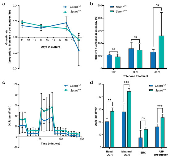 In order to investigate whether there may be intrinsic differences between wild type Sarm1+/+ and Sarm1−/− cells, primary fibroblasts were extracted from age and sex-matched mice (n = 5) of each genotype and cultured for 21 days. Growth rates of cells of each genotype did not differ significantly (Figure 5a).