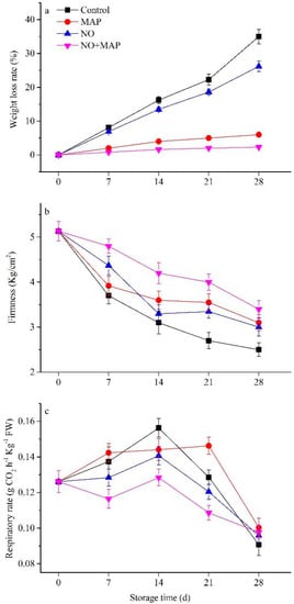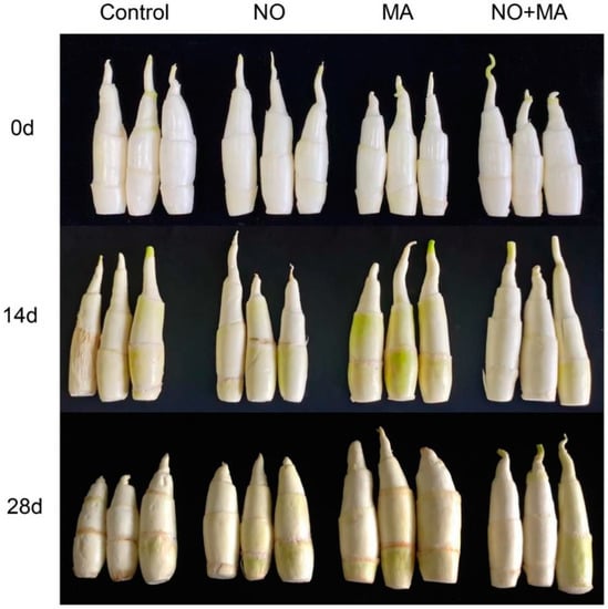 2.1. Effects of NO and MAP on Appearance, Weight Loss, and Firmness of Water Bamboo Shoots during Cold Storage