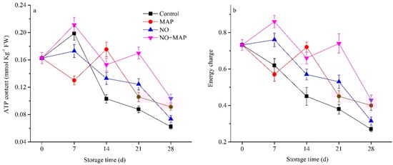 2.3. Effects of NO and MAP on ATP and Energy Charge Levels of Water Bamboo Shoots during Cold Storage