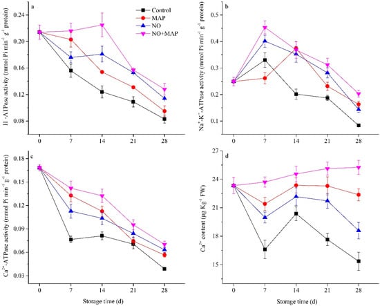 2.5. Effects of NO and MAP on ATPase Activity and Ca2+ Content of Water Bamboo Shoots during Cold Storage