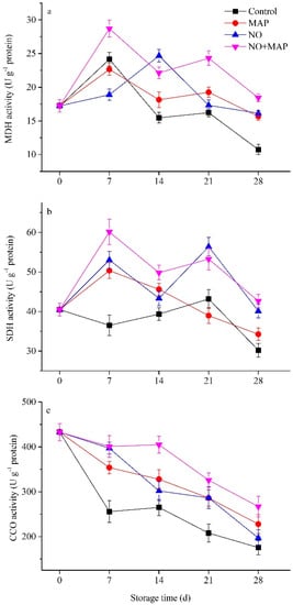 2.6. Effects of NO and MAP on Enzyme Activities of MDH, SDH, and CCO of Water Bamboo Shoots during Cold Storage
