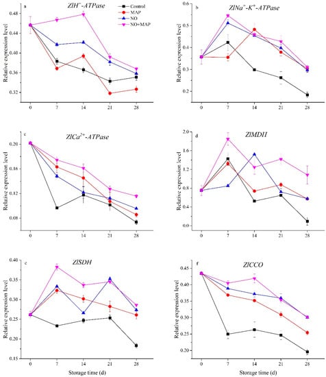 2.7. Effects of NO and MAP on the Expression of ZlH+-ATPase, ZlNa+-K+-ATPase, ZlCa2+-ATPase, ZlMDH, ZlSDH, and ZlCCO of Water Bamboo Shoots during Cold Storage