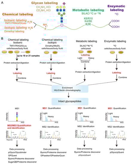 Labeling-based strategies for quantitative glycoproteomics. (A) Available positions on an intact glycopeptide for different labeling strategies. For example, chemical labeling reagents react with the amines at peptide N-termini or lysine side chains. (B) Sample preparation workflow for various labeling strategies.