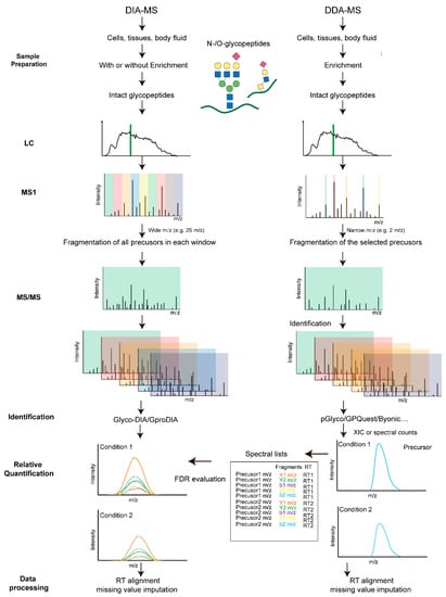 Label-free quantification (LFQ) methods aim at quantifying glycopeptides without the use of stable-isotope labels. The samples to be compared were prepared separately, including protein extraction, digestion, glycopeptide enrichment and parallel LC-MS/MS measurements. The extracted ion currents (XIC) or spectral counts of identified glycopeptides across runs were compared. Depending on the MS acquisition methods, the LFQ can be classified into data-dependent acquisition (DDA) and data-independent acquisition (DIA) based quantification (Figure 3). In the DDA mode, the most abundant precursor ions detected in an MS1 survey scan are selected and isolated sequentially with a narrow mass-to-charge (m/z) window (usually 0.5–2 Th) for MS2 fragmentation. The number of selected precursors per acquisition cycle is based on the survey scans and pre-defined settings. In the DIA mode, however, precursor isolation ranges (usually > 10 Th), the number of MS2 events and precursor m/z coverage are pre-defined. Each acquisition cycle repeats the same scan events accordingly, independent of the data acquired.