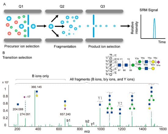 In targeted acquisition methods, such as selected or multiple reaction monitoring (SRM or MRM) or parallel reaction monitoring (PRM), LC-MS assays are deployed to detect glycopeptides of interest with high sensitivity, reproducibility and quantitative accuracy. SRM analysis was initially developed on triple quadrupole instruments, where the first quadrupole (Q1) scans for a pre-defined precursor, which undergoes CID fragmentation in the second quadrupole (Q2). Subsequently, pre-defined ions among the resulting fragments are scanned in the third quadrupole (Q3) (Figure 4A).