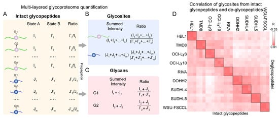 We recently proposed the SugarQuant workflow for multiplexed quantitative site-specific N-glycoproteomics [27]. In the workflow, we introduced a data processing pipeline termed GlycoBinder for streamlined protein glycosylation quantification at multiple levels. As mentioned above, GlycoBinder extracted and merged TMT reporter intensities for each identified glycopeptide. We then determined the abundance of each site-specific glycoform and deduced its intensity ratio among samples to be compared (Figure 5A). Most multiplexed quantitative glycoproteomic studies stopped at this level. We took our study a step further and propagated the intensities of site-specific glycoforms to determine the glycosylation changes of individual glycosites (Figure 5B). Therefore, SugarQuant enables the simultaneous determination of the site-specific macro- and micro-heterogeneity of protein glycosylation in a single experiment. We also extended the strategy to calculate the changes in unique glycans by summing the intensities of all glycoforms bearing the same glycans (Figure 5C). To validate the SugarQuant result, we profiled the glycoproteome of nine diffuse large B-cell lymphoma (DLBCL) cell lines using the SugarQuant pipeline and a separate global de-glycopeptide analysis [110] Next, we compared the glycosylation levels of quantified glycosites determined by the two methods in the DLBCL cells. As shown in Figure 5D, our results revealed a good correlation (mean Pearson correlation coefficient > 0.7) between the two approaches. Although this concept was only validated in isobaric labeling-based glycoproteome quantification, it is in theory applicable to other quantification methods.