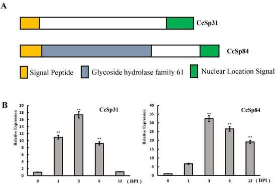 CcSp31 and CcSp84 were significantly up-regulated during infection stages. (A) Schematic diagram of candidate effectors CcSp31 and CcSp84. (B) Relative expression levels of CcSp31 and CcSp84 during infection processes. The expression levels were monitored using reverse transcription-quantitative polymerase chain reaction (qRT-PCR). RNA was extracted at 0, 1, 3, 6, and 12 days post-inoculation (DPI) on the poplar twigs with Cytospora chrysosperma. The experiments were performed in triplicate. ** p < 0.01.