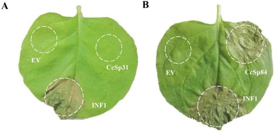 To investigate the function of CcSp31 and CcSp84 during the interaction processes, CcSp31 and CcSp84 were cloned into the binary vector pGR106 without signal peptide, respectively [], and then transiently expressed in N. benthamiana leaves by using the Agrobacterium tumefaciens-mediated system. After 3 days of infiltration, CcSp31 neither induced cell death nor suppressed the INF1-induced cell death in N. benthamiana leaves (Figure 2A and Figure S1). Remarkably, CcSp84 could induce cell death in N. benthamiana leaves as the INF1 did, but it could not suppress the INF1-induced cell death in N. benthamiana leaves (Figure 2B), indicating that CcSp84 acted as an elicitor and could induce cell death in N. benthamiana leaves.