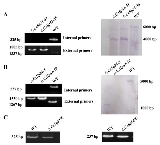 Screening for the CcSp31 and CcSp84 deletion mutants. (A,B) The CcSp31 and CcSp84 deletion mutants were confirmed by PCR with internal primers and external primers and Southern blot analysis. (C) The complementary strains were verified by PCR with internal primers.