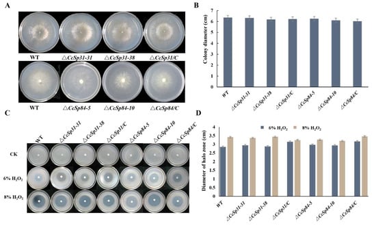 2.3. CcSp31 and CcSp84 Were Not Required for Fungal Growth and the Resistance to H2O2