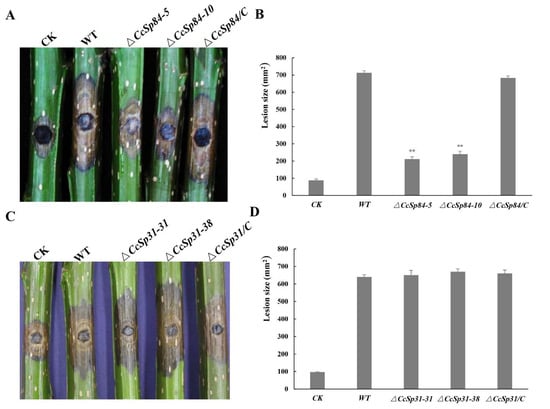The CcSp84 deletion mutants reduce the pathogenicity of C. chrysosperma. (A,B) Inoculated poplar branches with wild-type, CcSp84 deletion mutants, and complemented strains, the lesion areas were measured at 4 dpi. (C,D) Inoculated poplar branches with wild-type, CcSp31 deletion mutants, and complemented strains, the lesion areas were measured at 4 dpi. The asterisks on the bars indicate a significant difference from the wild-type strain (** p < 0.01). The experiments were repeated three times.