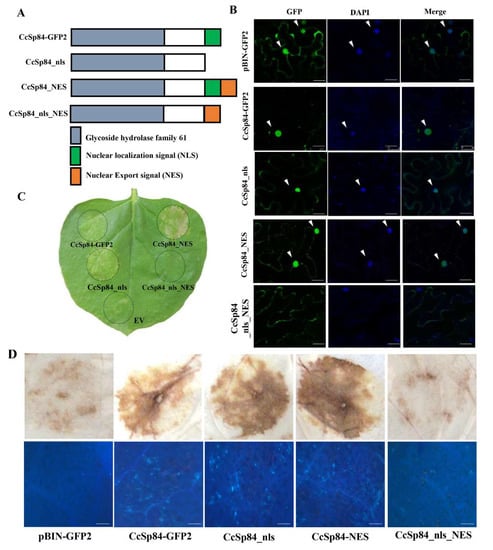 In order to verify the influence of different positioning conditions on CcSp84, several mutant types of CcSp84 were generated and cloned into pBINGFP2, including the CcSp84_nls_NES (the NLS sequence was removed, and a nuclear export signal (NES) sequence was added at the C-terminal), CcSp84_nls (the NLS sequence in CcSp84 was removed), and CcSp84_NES (an NES sequence was added at the C-terminal of CcSp84). The original plasmids pGR106 (EV) and pBINGFP2 were kindly provided by Pro. Daolong Dou from Nanjing Agricultural University.