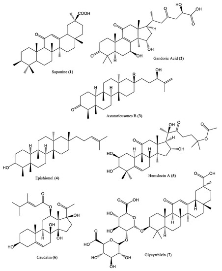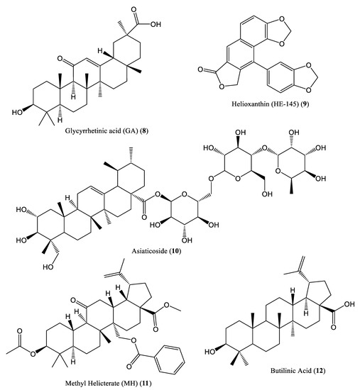 Terpenes are linear or cyclic compounds consisting of five-carbon isoprene basic structural units (saturated or unsaturated). Isoprene units can assemble in several different ways, thereby resulting in a wide variety of secondary metabolites. Terpenoids are modified terpenes with different functional groups, and oxidized methyl groups are moved or removed at various positions in these compounds. With varying structures that result in diverse functionality, terpenoids are potential biologically active compounds, and many of them exhibit inhibitory activities against various human cell lines; for example, Taxol and its derivatives are used as anticancer drugs due to their inhibitory effects on cancer cell proliferation [23]. The structures of various terpenoid compounds that interfere with HBV DNA replication are presented in Figure 1. A triterpenoid saponin (1) was extracted from the Tibetan herb, Potentilla anserina, using ethanol, and its in vivo anti-HBV effects were evaluated in Peking ducklings. Reportedly, this compound inhibited duck hepatitis B (DHBV) DNA replication [24]. Furthermore, saponins were extracted from the traditional Chinese herbal medicinal plant, Abrus cantoniensis Hance (AC), and their anti-HBV effects were evaluated both in vitro and in vivo [25]. The saponin extract decreased HBV DNA production in both HepG2.2.15 cells and C57BL/6 mice infected with recombinant HBV [25]. In mice treated with the saponins, the percentage of CD4+ and T cells in their spleens and serum IFN-γ levels were also upregulated [25]. Ganoderic acid (2), isolated from Ganoderma lucidum, inhibited HBV replication in HepG2.2.15 cells when they were treated at 8 µg/mL for up to eight days [26]. Two terpenoid compounds, astataricusone B (3) and epishionol (4), were isolated from the roots and rhizomes of Aster tataricus, and found to exhibit inhibitory activity against HBV DNA replication, with IC50 (half-maximal inhibitory concentration) values of 2.7 and 30.7 μM/L, respectively [27]. Hemslecin A (5), extracted from flowering plants of the genus Hemsleya, inhibited HBV DNA replication, with an IC50 value of 11.2 μM (SI = 5.8) in HepG2.2.15 cells [28]. The climbing vine swallowwort, Cynanchum auriculatum, reportedly contains the terpenoid compound caudatin (6), which inhibits HBV DNA replication, with an IC50 value of 40.62 mM/L (SI = 6.0) [29]. Glycyrrhizin (7) and its metabolite, glycyrrhetinic acid (GA) (8), are the main constituents of Licorice roots (Glycyrrhizae glabra), and exhibit inhibitory activity against HBV DNA replication (IC50 = 39.28 μM/L) [30]. Helioxanthin (HE-145) (9) was extracted from the heartwood, Taiwania cryptomerioides hayata, and inhibited HBV replication in HCC cells. HE-145 reportedly decreased HBV DNA-binding activity in HepA2 cells, with a unique anti-HBV mechanism, and, thus, is a potential anti-HBV agent [31]. Asiaticoside (10), isolated from Hydrocotyle sibthorpioides, significantly reduced HBV transcription, replication, as well as cccDNA levels, by suppressing the promoter activities of the core S1, S2, and X genes in HepG2.2.15 cells [32]. In addition, the phytocompound methyl helicterate (MH) (11), isolated from the Chinese herb Helicteres angustifolia, significantly reduced cccDNA and viral RNA levels in HepG2.2.15 cells and DHBV-infected ducklings [33]. Lupane-type triterpenoids, including betulinic acid (12), were isolated from T. conophorum seeds, characterized, and their anti-HBV effects were investigated in rat models and HepG2 cells. These compounds showed hepatoprotective and cytotoxic activities, which may be due to their interaction with HBV, as the compounds exhibited high binding affinities for the virus [34].