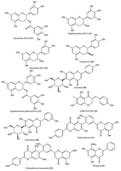 Flavonoids constitute a diverse range of polyphenolic structures found in many natural substances, such as fruits, vegetables, grains, bark, roots, stems, flowers, tea, and wine. Currently, flavonoids are considered indispensable tools in the field of human physiology due to their anti-oxidative, anti-inflammatory, anti-mutagenic, and anti-carcinogenic properties. The flavonoids of medicinal interest can be classified into several groups, such as flavonols, flavones, flavanones, isoflavones, and anthocyanidins [35]. The chemical structures of some flavonoid compounds affecting HBV DNA replication are shown in Figure 2. Camellia sinensis (green tea), which contains epicatechin (ECG), epigallocatechin (EGC), epicatechin (EC), catechin (C), and epigallocatechin gallate (EGCG) (13–17), exhibits significant antiviral activity through various mechanisms. The antiviral effects of green tea extract (GTE) were evaluated for HBV in Hep2-N10 cells by measuring viral antigen levels and quantifying viral DNA. The extract inhibited extracellular HBV DNA production. Moreover, GTE exhibited more significant antiviral effects than EGCG in HepG2.117 cells. EGCG targets only the replicative intermediates formed during DNA synthesis; for example, it was found to reduce HBV cccDNA production [36,37]. Isovitexin (18), a flavonoid isolated from Swertia yunnanensis, exhibits significant anti-HBV effects and suppresses HBV DNA replication, with IC50 values of 0.09 mM, <0.01 mM, and 0.05 mM [38]. The flavonoid compound LPRP-Et-97543 (19), isolated from Liriope muscari (Decne.) L.H.Bailey, exhibited significant anti-HBV activity and significantly suppressed the activities of the core, S, and preS promoters and viral DNA replication by regulating viral proteins [39]. Isooriention (20), isolated from Swertia mussotii, inhibited HBV DNA replication, with an IC50 value of 0.02 mM [40]. Robustaflavone (21), extracted from Rhus succedanea, showed potent inhibitory effects against HBV replication in HepG2.2.15 cells, with a 50% effective concentration (EC50) of 0.25 mM, and an SI of 153 [41]. Robustaflavone hexaacetate (22) inhibited HBV replication, with an EC50 value of 0.73 mM/L, whereas wogonin (23), isolated from Scutellaria baicalensis reduced the levels of relaxed circular and linear forms of HBV DNA [42].