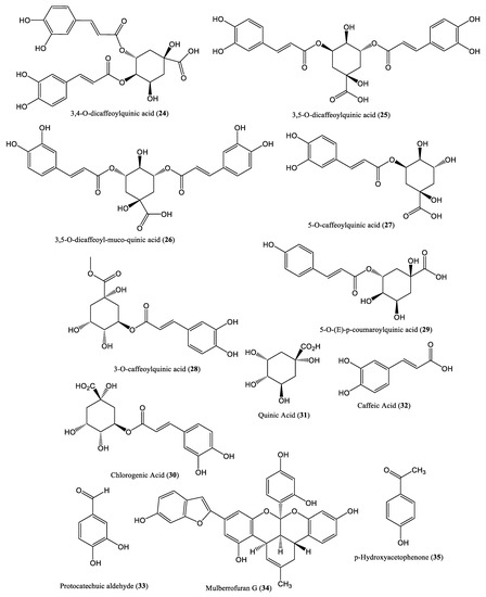 Phenolic and polyphenolic compounds constitute one of the largest and most widespread plant secondary metabolite groups, and they possess significant antiviral and antioxidant properties. Although polyphenols include a wide range of molecules that exhibit different biological activities, their core structure is composed of a benzene ring and a hydroxyl functional group [43]. The chemical structures of various phenolic and polyphenolic compounds of plant origin, which affect HBV DNA replication, are presented in Figure 3. The in vitro anti-HBV effects of the polyphenolic extract of Geranium carolinianum L. (PPGC) were evaluated in HepG2.2.15 cells, and the extract was found to decrease HBsAg and HBeAg secretion, with IC50 values of 46.85 μg/mL and 65.60 μg/mL, respectively. Southern blot analysis further confirmed that PPGC decreased plasma and liver DHBV DNA levels in infected ducklings in a dose-dependent manner [44]. The plant Oenanthe javanica (OJ) is widely used for the treatment of hepatitis; the HepG2.2.15 cell line and a DHBV infection model were used as in vitro and in vivo models, respectively, to investigate the anti-HBV effects of its total phenolic extract. It was found that OJ significantly inhibited HBV replication in HepG2.2.15 cells and inhibited DHBV replication in ducks [45]. Several quinic acid derivatives, including 3,4-O-dicaffeoylquinic acid, 3,5-O-dicaffeoylquinic acid, 3,5-O-dicaffeoyl-muco-quinic acid, 5-O-caffeoylquinic acid, 3-O-caffeoylquinic acid, and 5-O-(E)-p-coumaroylquinic acid (24–29), extracted from the aerial parts of Lactuca indica L. (Compositae), effectively decreased HBV DNA levels in HepG2.2.15 cells [46]. Chlorogenic acid (30) and its related compounds, which are found in the leaves and fruits of dicotyledonous plants such as the coffee plant, exhibit antiviral activity. Chlorogenic acid, quinic acid (31), and caffeic acid (32) reportedly inhibit HBV DNA replication in the HepG2.2.15 cell line [47]. Protocatechuic aldehyde (PA) (33), isolated from Salvia miltiorrhiza, reduced HBV DNA release in HepG2.2.15 cells in a dose- and time-dependent manner. At the doses of 25, 50, or 100 mg/kg (administered intraperitoneally, twice daily), PA reduced viremia in ducks infected with DHBV [48]. Mulberrofuran G (34), isolated from the root bark of Morus alba L., exhibited moderate inhibitory activity against HBV in HepG2.2.15 cells by inhibiting its DNA replication, with an IC50 value of 3.99 μM/L [49]. Similarly, p-Hydroxyacetophenone (p-HAP) (35), isolated from Artemisia morrisonensis, exhibited inhibitory activity against HBV DNA replication, with an IC50 value of 306.4 μM/L [50].