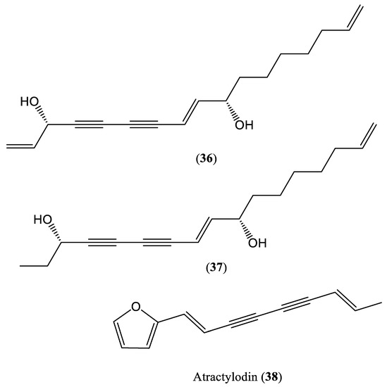 Enynes, which are organic compounds consisting of a carbon–carbon double bond (C=C) and a carbon–carbon triple bond, can inhibit HBsAg and HBeAg secretion. The chemical structures of some enyne compounds affecting HBV DNA replication are shown in Figure 4. Artemisia capillaris (Yin-Chen) contains enynes (36–37), and its extracts were evaluated in HepG2.2.15 cells to determine the active components responsible for its anti-HBV effects. The results showed that the compound atractylodin (38), isolated from this herb, significantly inhibited HBV DNA replication, with an IC50 value of 9.8 μM (SI > 102), and the hydroxyl and glycosyl groups were found to be responsible for maintaining this activity [51].