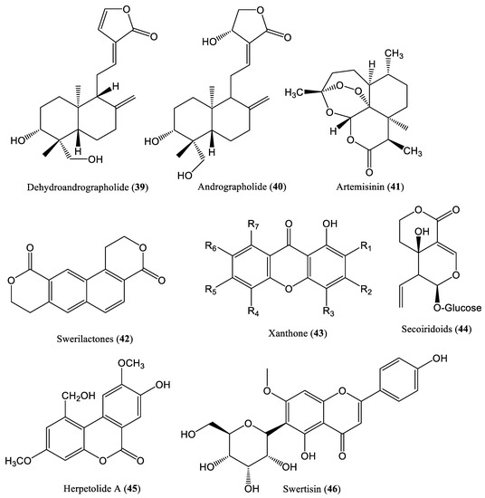 The intramolecular condensation of hydroxycarboxylic acids leads to the formation of cyclic esters known as lactones. Most lactones that exhibit biological activity are macrocyclic [52]. Dehydroandrographolide (39) (Figure 5) and andrographolide (40), isolated from Andrographis paniculata, reportedly exhibited inhibitory activity against HBV DNA replication in HepG2.2.15 cells, with IC50 values of 22.58 and 54.07 μM/L and low SI values of 8.7 and 3.7 μM/L, respectively [53]. Another lactone compound, artemisinin (41), isolated from Artemisia annua, inhibited HBV DNA replication in HepG2.2.15 cells, with an IC50 value >100 mM/L [54]. The plant Swertia mileensis contains swerilactones (42), which inhibit HBV DNA replication, with IC50 values ranging from 1.53 to 5.34 μM/L [55]. Wang et al. extracted xanthone (43) and secoiridoid lactone (44) from Swertia punicea, and investigated their anti-HBV effects [56]. They found that xanthone and secoiridoid lactone inhibited HBV DNA replication in HepG2.2.15 cells, with IC50 values of 0.18 and 0.19 mM, respectively [56]. The plant Herpetospermum caudigerum contains herpetolide A [57]. Zhong et al. prepared a herpetolide A (45) nanosuspension lyophilized powder (HPA-NS-LP) and evaluated its anti-HBV effects in HepG2.2.15 cells [58]. They found that HPA-NS-LP significantly decreased HBV DNA levels [58]. Swertisin (46), isolated from the traditional Chinese medicinal herb Iris tectorum Maxim, significantly downregulated HBV DNA production in a dose-dependent manner in HepG2.2.15 cells, a de novo HepG2-NTCP cell infection model, and HBV transgenic mice [59].