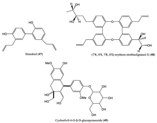 The non-flavonoid polyphenols known as lignans are widely distributed in the plant kingdom. Lignans exhibit antiviral, antioxidant, antibacterial, and antifungal activities in animal models. Lignans have diverse and complex chemical structures, although they are essentially dimers of phenylpropanoid units (C6-C3) linked by the central carbons of their side chains [60]. The chemical structures of some lignan compounds that affect HBV DNA replication are shown in Figure 6. The methanol extract of Streblus asper roots contains honokiol (47) and (7′R, 8′S, 7′R, 8′S)-erythron-strebluslignanol G (48), which reportedly show significant anti-HBV activity. These compounds significantly inhibit HBV DNA replication in Hep G2.2.15 cells transfected with HBV, with IC50 values of 9.02 and 8.67 μM, respectively [61,62]. Zhou et al., isolated cycloolivil-4-O-β-D-glucopyranoside (49) from Stereospermum cylindricum and evaluated its anti-HBV effects in HepG2.2.15 cells [63]. The compound was found to inhibit HBV DNA replication, with an IC50 value of 0.29 ± 0.034 mM (SI = 4.66) [63].