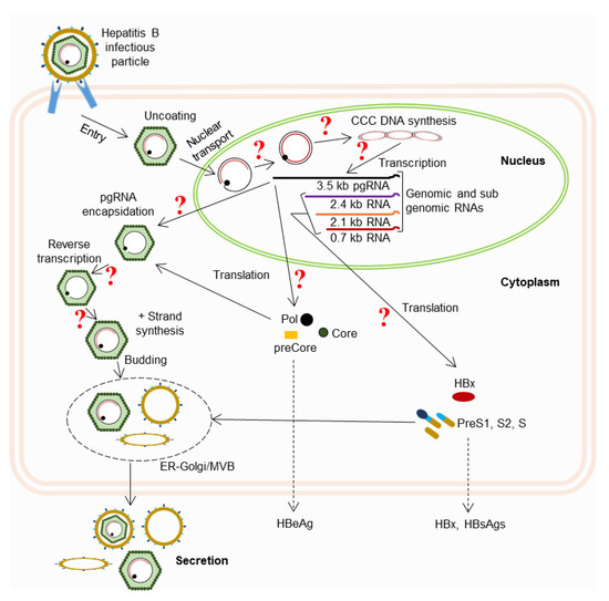 HBV replication cycle showing the possible steps in the DNA replication process that can be affected by phytomedicines/phytochemicals. The “?” mark indicates the possible steps where the phytomedicines may show inhibitory activity towards HBV DNA replication.