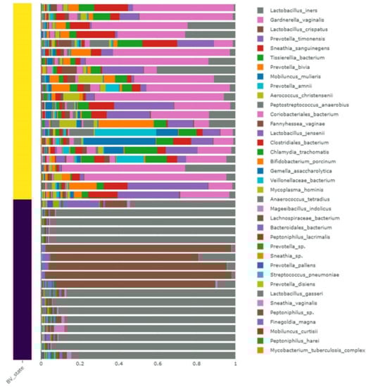 Relative abundance of identified bacteria in 40 different samples at species level. Yellow and purple bars indicate positive and negative samples for BV state, respectively. Only abundantly present bacterial species are listed in the legend.
