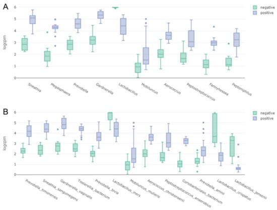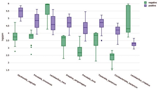 We compared the abundance of abundantly present bacterial species between the negative and positive groups according to BV state. For that, we calculated normalized read counts (logCPM). Of eight representative bacterial species, the logCPM values in the negative group for G. vaginalis, P. timonensis, S. sanguinegens, P. bivia, and Coriobacteriales bacterium were much higher than those in the positive group (Figure 2). By contrast, the logCPM values for L. iners and L. crispatus in the positive group were much higher than those in the negative group (Figure 2).