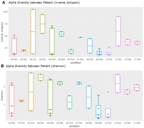 Comparison of alpha diversity of bacterial species among different subjects using inverse Simpson (A) and Shannon (B) methods. The Kruskal–Wallis rank sum test was conducted, resulting in p-values of 0.0897 and 0.09 for the inverse Simpson and Shannon, respectively.