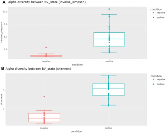 Next, we compared the alpha diversity between the two groups according to BV state (Figure 4). The diversity of bacterial species in the negative group was much lower than that in the positive group, as shown by the inverse Simpson and Shannon indexes (Figure 4). To determine whether there was a significant difference in bacterial species diversity between the negative and positive groups, we performed two different statistical tests. Both the Wilcoxon rank sum exact test (p-value less than 0.05) and Welch two-sample t-test results (p-value less than 0.05) clearly confirmed the significant difference in the alpha diversity between the two groups.