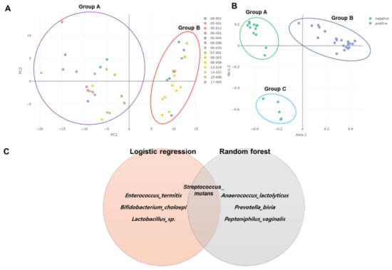 Dimension reduction analyses and identification of biomarkers. Principal component analysis (PCA) and principal coordinate analysis (PCoA) were conducted for 16 subjects (A) and two groups of BV state (B), respectively. Identification of biomarkers by two different machine learning algorithms (C).