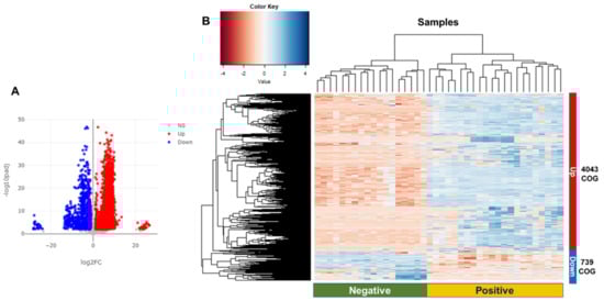Identification of differentially abundant Clusters of Orthologous Genes (COGs) functions and hierarchical clustering analysis (HCL) of identified COGs. Volcano plots show distribution of fold changes and adjusted p-values for the differentially abundant functions identified by DESeq2 (A). Blue- and red-colored dots indicate the downregulated (Down) and upregulated (Up) COGs, respectively, by comparing the positive group to the negative group according to BV state. NS indicates no significant COG functions. Using the number of mapped reads on the assigned COGs, HCL was conducted (B).