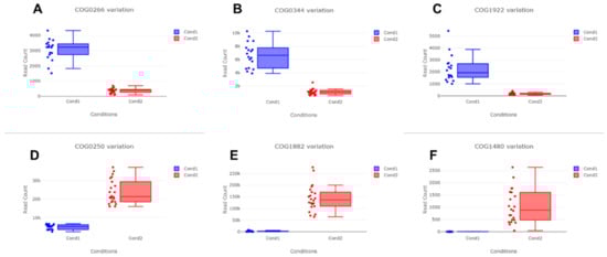 Six representative COGs identified as differentially abundant COGs between two groups. Blue (Cond1) and red (Cond2) colors indicate negative and positive groups, respectively. (A) COG0266 formamidopyrimidine-DNA glycosylase; (B) COG0344 phospholipid biosynthesis protein PlsY; (C) COG1922 UDP-N-acetyl-D-mannosaminuronic acid transferase; (D) COG0250 transcription antitermination factor NusG; (E) COG1882 pyruvate-formate lyase; and (F) COG1480 predicted membrane-associated HD superfamily hydrolase.