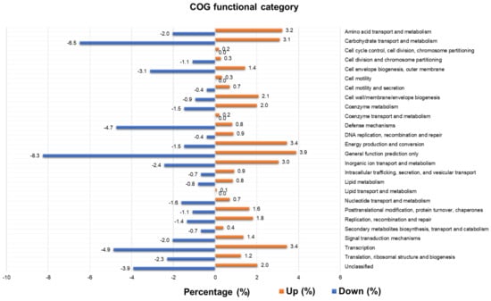 We calculated the relative abundance of COGs in the upregulated and downregulated groups (Figure 9 and Table S10). As compared to the upregulated group, several functional categories (e.g., carbohydrate transport and metabolism (6.5%), cell envelope biogenesis, outer membrane (3.1%), defense mechanisms (4.7%), general function prediction only (8.3%), transcription (4.9%), translation, ribosomal structure, and biogenesis (2.3%), and unclassified (3.9%)) were higher in the downregulated group.