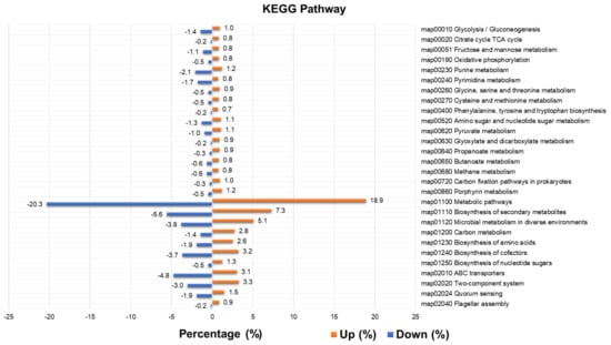 Relative enzyme abundance of 28 representative Kyoto Encyclopedia of Genes and Genomes (KEGG) pathways in upregulated and downregulated groups.