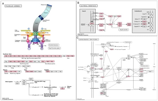 Three KEGG pathways enriched in upregulated group. Identified enzymes assigned to pathways associated with (A) flagellar assembly, (B) bacterial chemotaxis, and (C) biofilm formation for V. cholerae. Pink-colored boxes indicate enzymes identified from vaginal transcriptome.