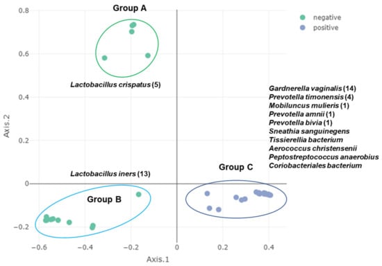 We conducted PCoA analyses using the mapped reads on the 176 bins (Table S14). We identified three groups of the 40 samples (Figure 14). Group A and Group B belonged to the BV-negative group, while Group C belonged to the BV-positive group. Group A contained five samples in which L. crispatus was abundantly present, while Group B contained 13 samples in which L. iners was abundantly present. Group C included 22 samples in which 10 major bacterial species, such as G. vaginalis, P. timonensis, and Mobiluncus mulieris, were abundantly present.