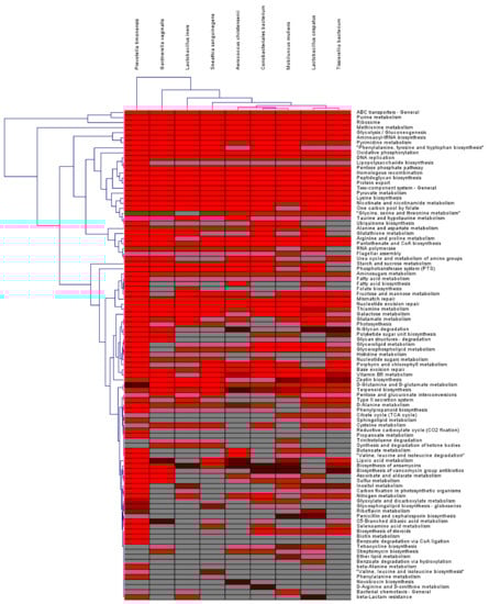 HCL of number of enzymes assigned to 97 KEGG pathways. As the number of enzymes increases, the red color becomes brighter. Gray color indicates no enzyme was identified in the given bacterial species.