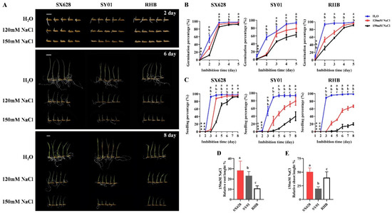 Comparison of seed germination and seedling establishment between SanXiang628 (SX628, highly salt-tolerant), SY01 (moderately salt-tolerant), and RHB (salt-sensitive) under control conditions and salinity stress. (A) Seed germination and seedling phenotypes in SX628, SY01, and RHB under control condition, and 120 mM and 150 mM NaCl solutions. Bars = 10 mm. (B,C) Statistical analysis of germination percentage (B) and seedling percentage (C) in SX628, SY01, and RHB under control condition, and 120 mM and 150 mM NaCl solutions after germination. Values are mean ± SD (n = 30). Data were analyzed using two-way ANOVA with post hoc Tukey tests (letters indicate significant differences between samples at p < 0.05). (D,E) Relative root length (D) and relative shoot length (E) at 8 DAG in SX628, SY01, and RHB under control condition and 150 mM NaCl solution. Data were analyzed using two-way ANOVA with post hoc Tukey tests (letters indicate significant differences between samples at p < 0.05).