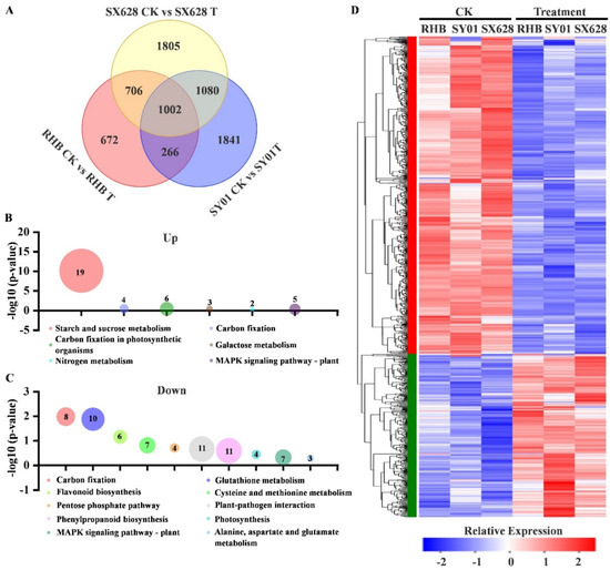 To identify significant gene upregulations after salinity treatment at the seedling stage, we investigated overlapping differentially expressed genes (DEGs) that were simultaneously upregulated or downregulated in all genotypes, i.e., highly salt-tolerant, moderately salt-tolerant, and salt-sensitive plants. As a result, 1002 DEGs were identified in three comparisons (SX628 CK vs. SX628 T, SY01 CK vs. SY01 T, RHB CK vs. RHB T); specifically, 340 and 662 DEGs were significantly upregulated and downregulated in these comparisons (Figure 3A,D). KEGG analysis categorized these upregulated DEGs as mainly related to starch and sucrose metabolism pathways (Figure 3B), and the downregulated DEGs were mainly related to several metabolic pathways, such as carbon fixation and glutathione metabolism (Figure 3C).