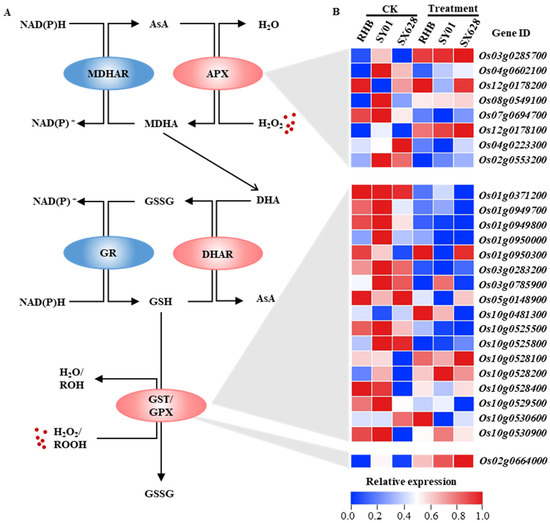 A number of antioxidants and nonenzymatic antioxidants, such as ascorbate (AsA), glutathione (GSH), and ascorbate peroxidase (APX), have been proven to be key players in the response to abiotic stress, and accumulating evidence has revealed the crucial roles of the Ascorbate–Glutathione (AsA–GSH) pathway during this process; thus, we investigated the gene expression levels corresponding to key enzymes of the AsA–GSH pathway after salinity treatment at the seedling stage (Figure 6A). Glutathione S-transferase (GST, Os01g0950300, Os10g0528100, Os10g0528200, and Os10g0530900) genes generally display significantly decreased or unchanged expression levels in salt-sensitive plants after treatment, whereas several GST genes were induced in highly salt-tolerant plants (Figure 6B). APX genes are known to regulate signal flux to maintain H2O2 homeostasis. Notably, different APXs displayed diverse expression patterns in plants; for example, OsAPX1 (Os03g0285700) and OsAPX8 (Os02g0553200) were found to be significantly upregulated and downregulated in all genotypes after salinity treatment (Figure 6B), suggesting multifaceted roles of OsAPXs in response to salt stress conditions. Additionally, the expression levels of several genes related to the AsA–GSH pathway were found to be upregulated or downregulated under salt treatment; for example, OsGPX3 (Os02g0664000) was significantly upregulated in highly salt-tolerant plants after treatment compared to that in the control (Figure 6B).